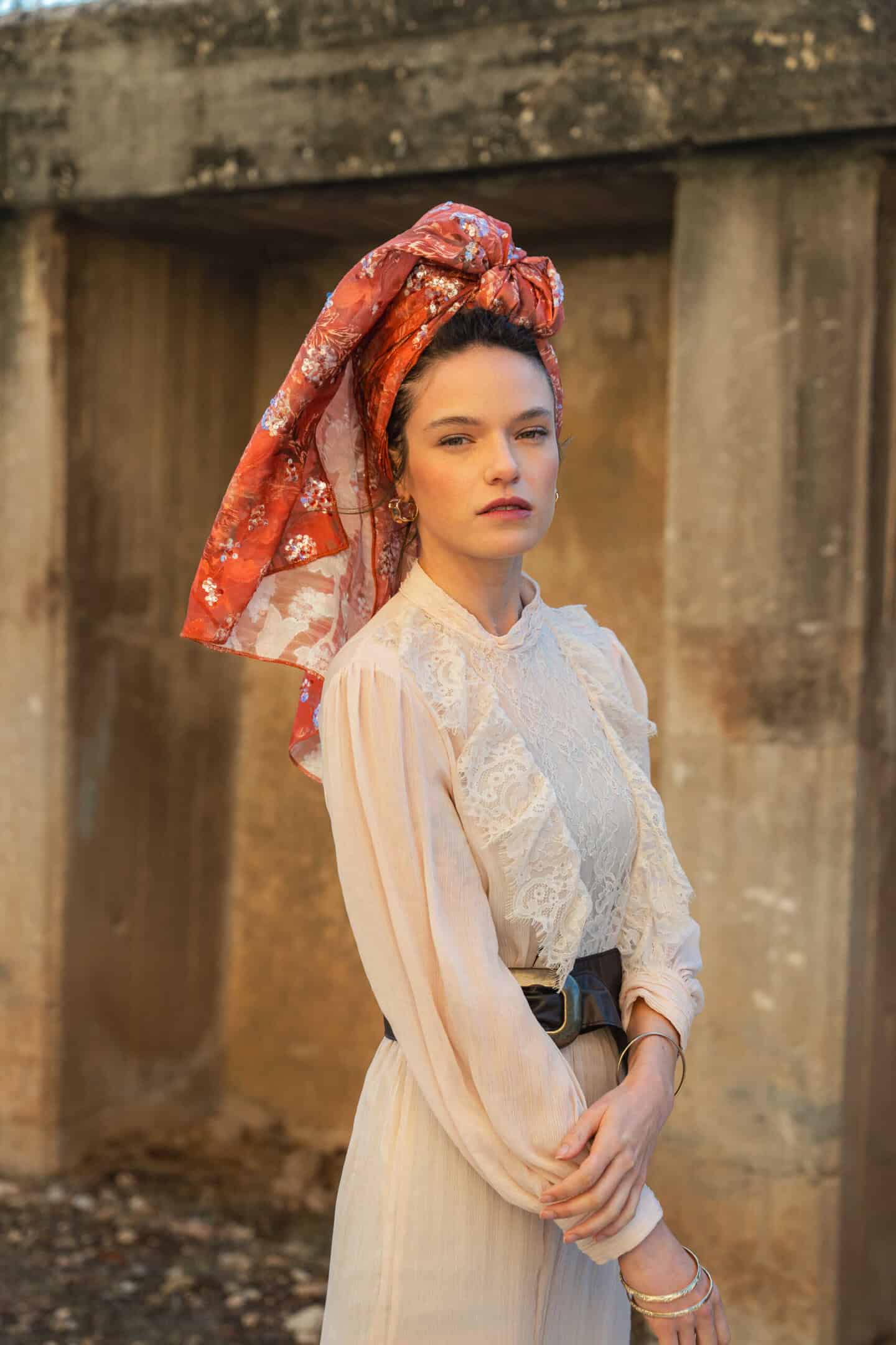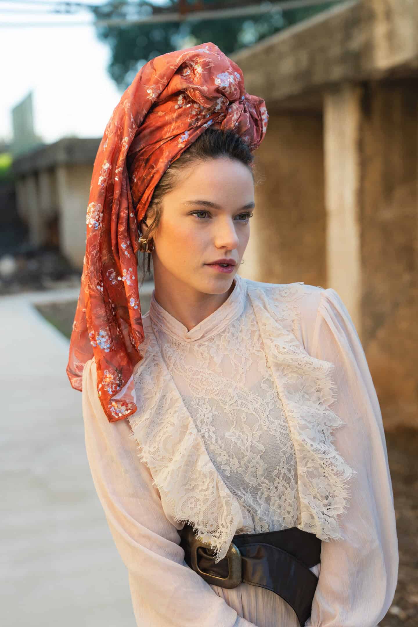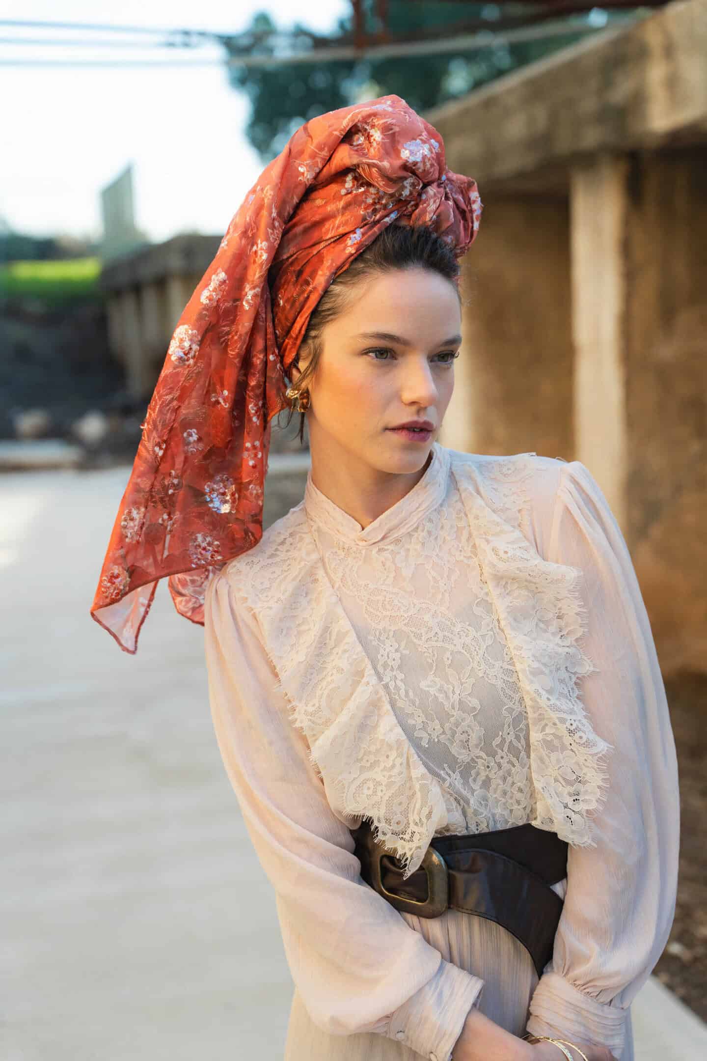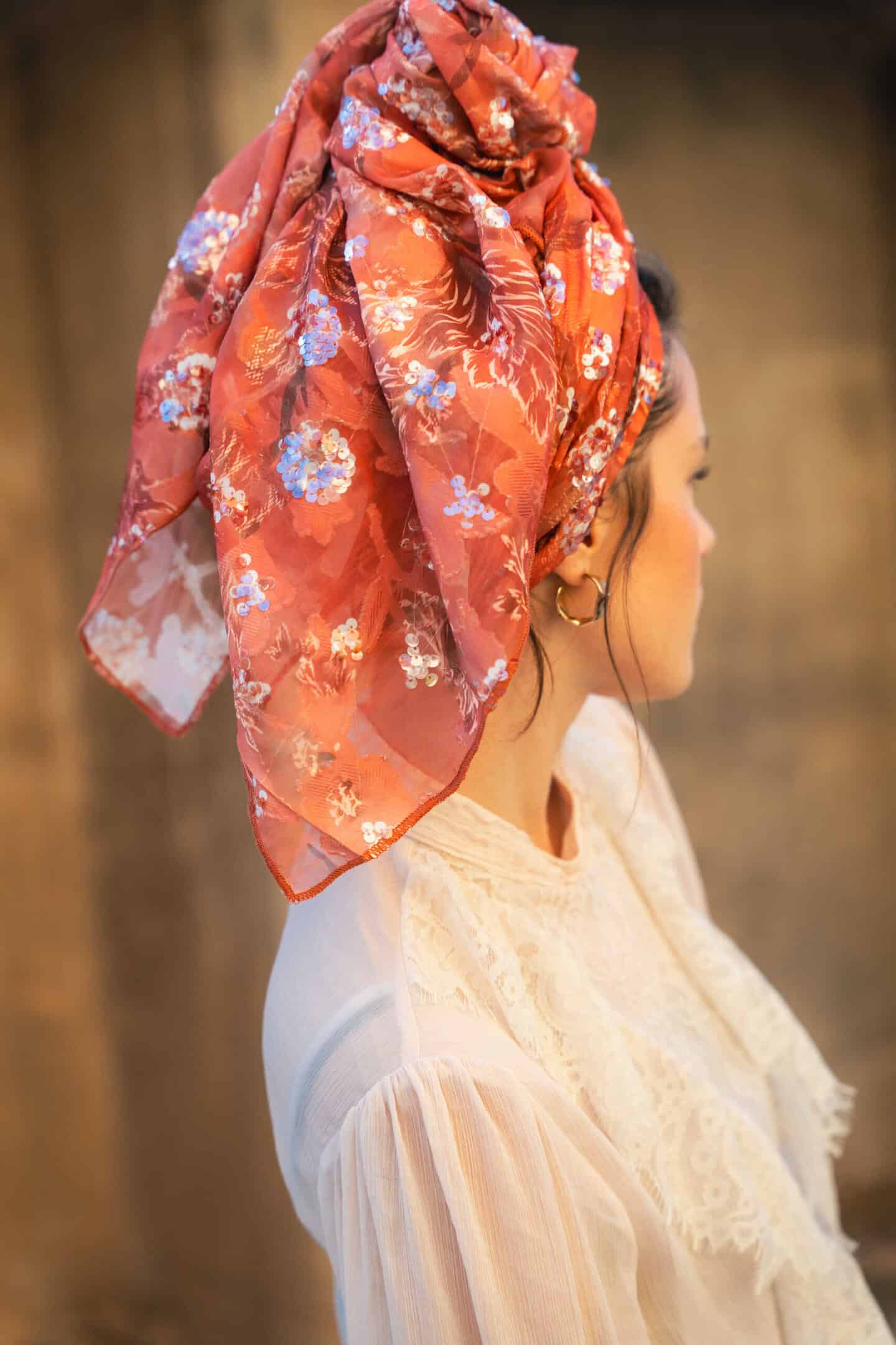 מטפחת ייחודית ומרגשת בהדפס אומנותי בגווני חום וחמרא עמוקים ובהירים משתנים בקצב