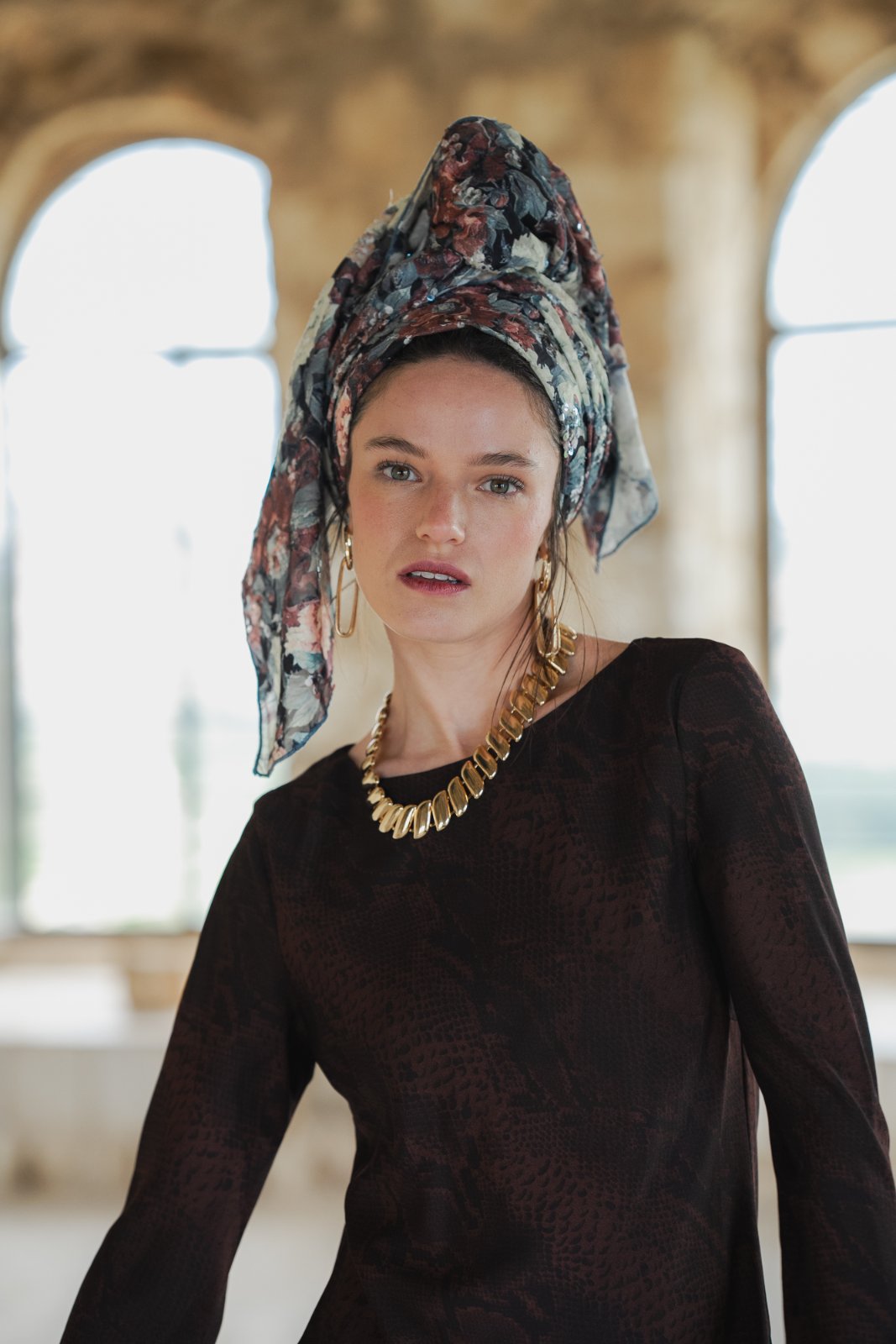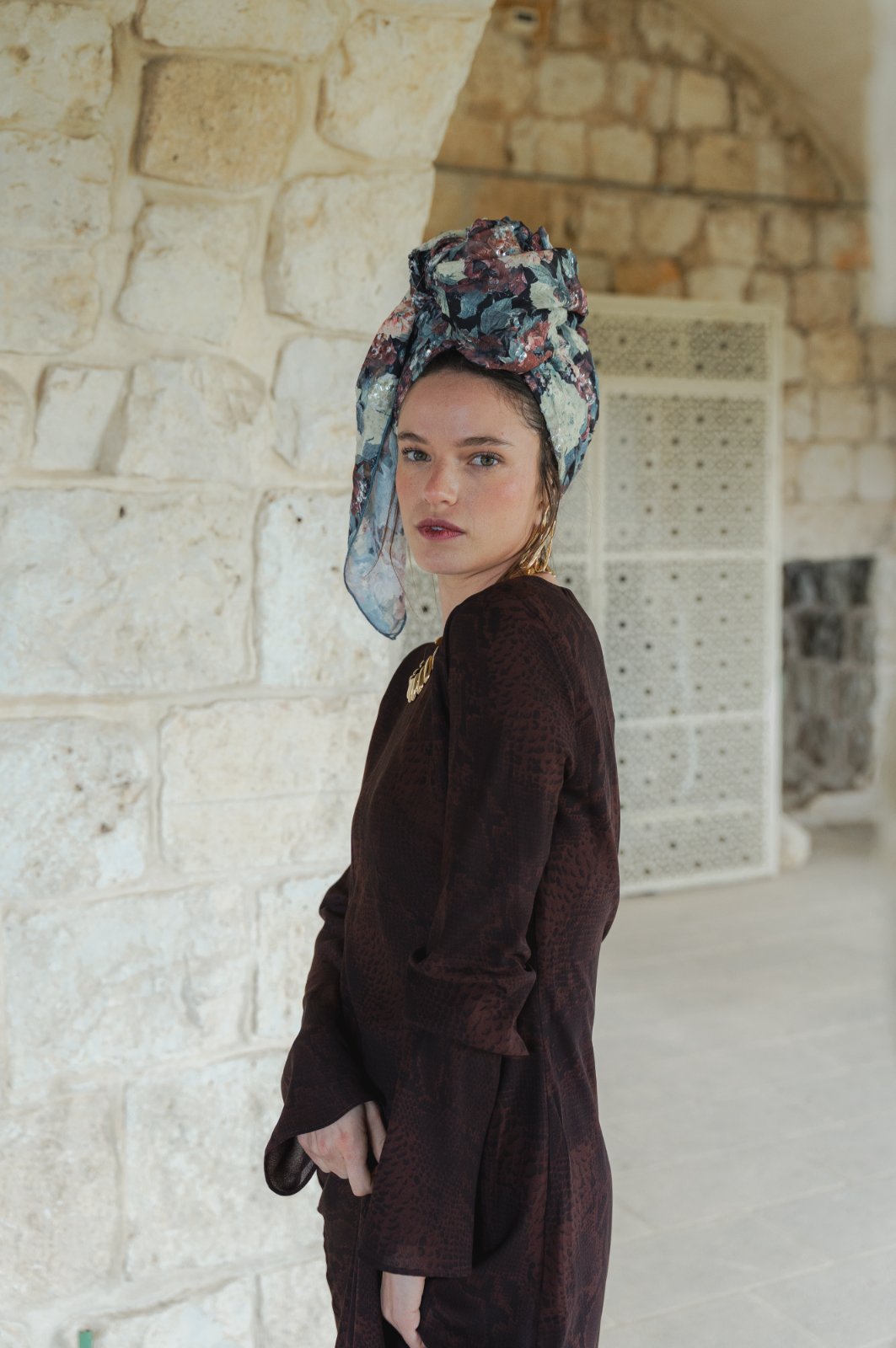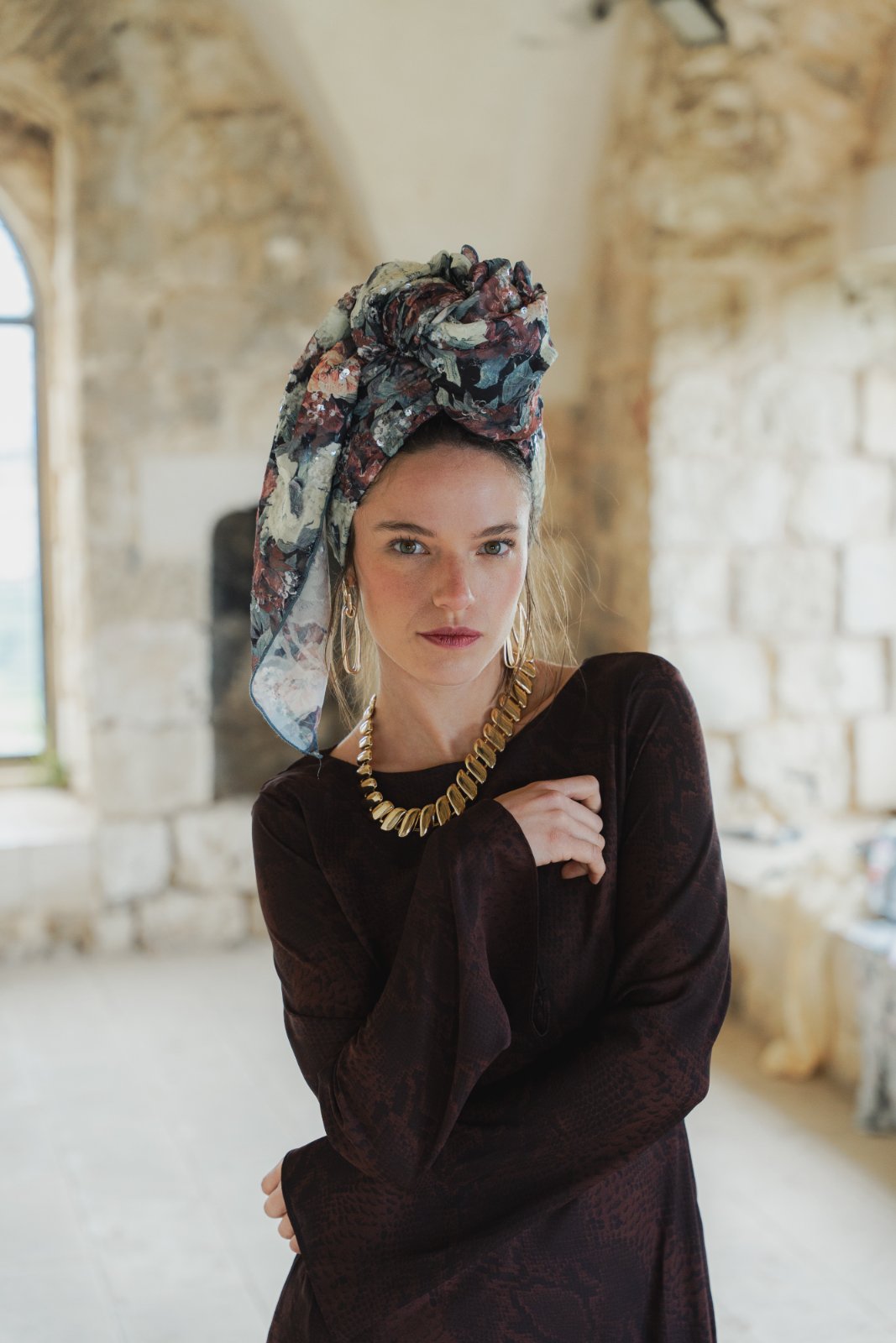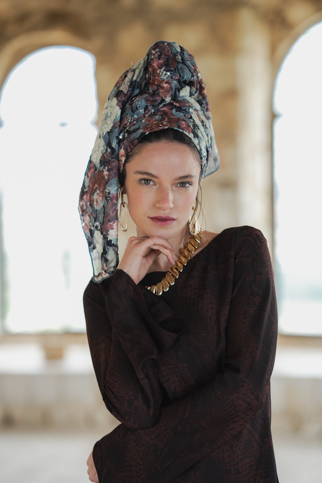 הדפס פרחוני עשיר ודרמתי בעל אופי ציורי, בגוונים עמוקים של בורדו, חמרה, כחול – אפרפר מעושן וירוק פטרול.