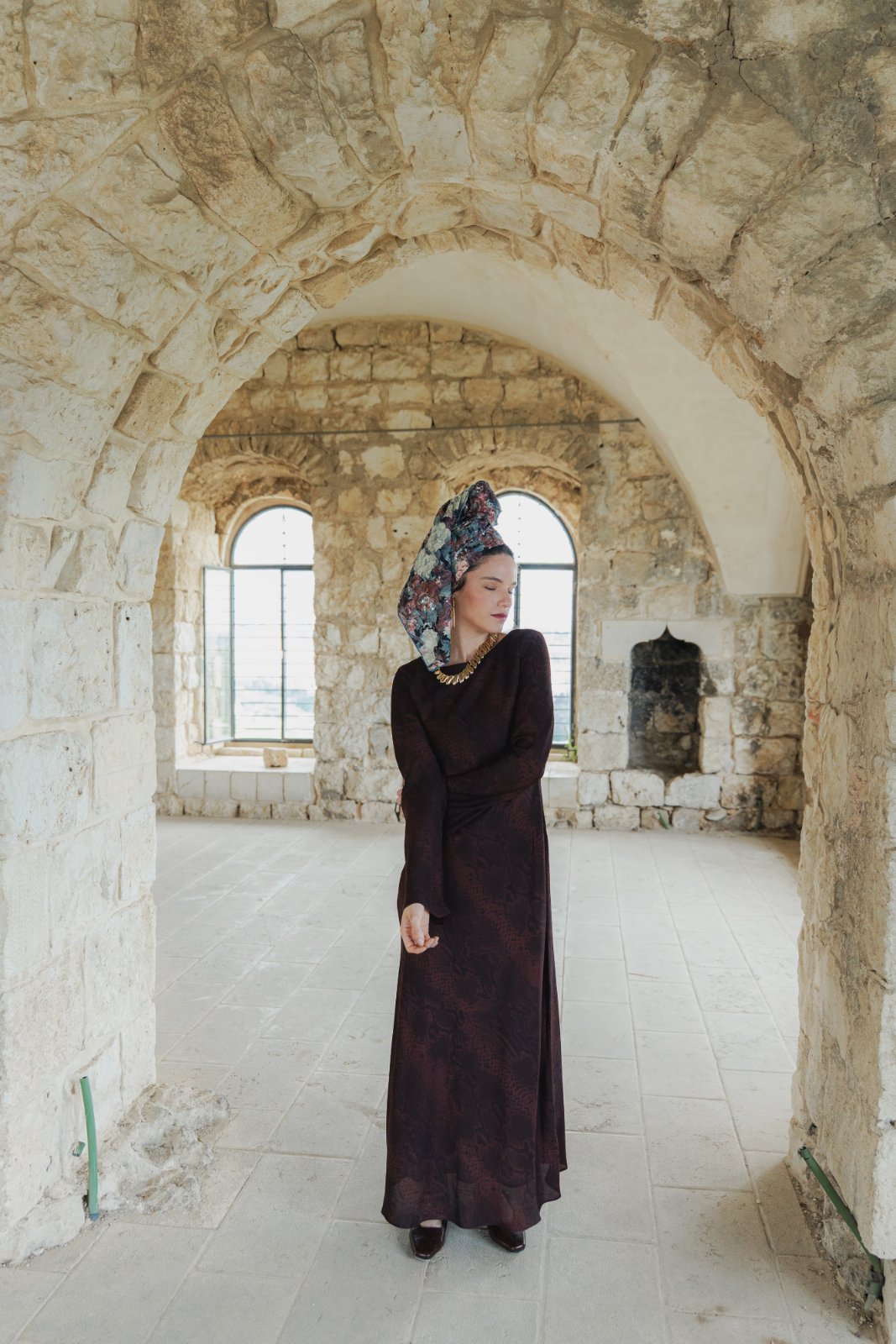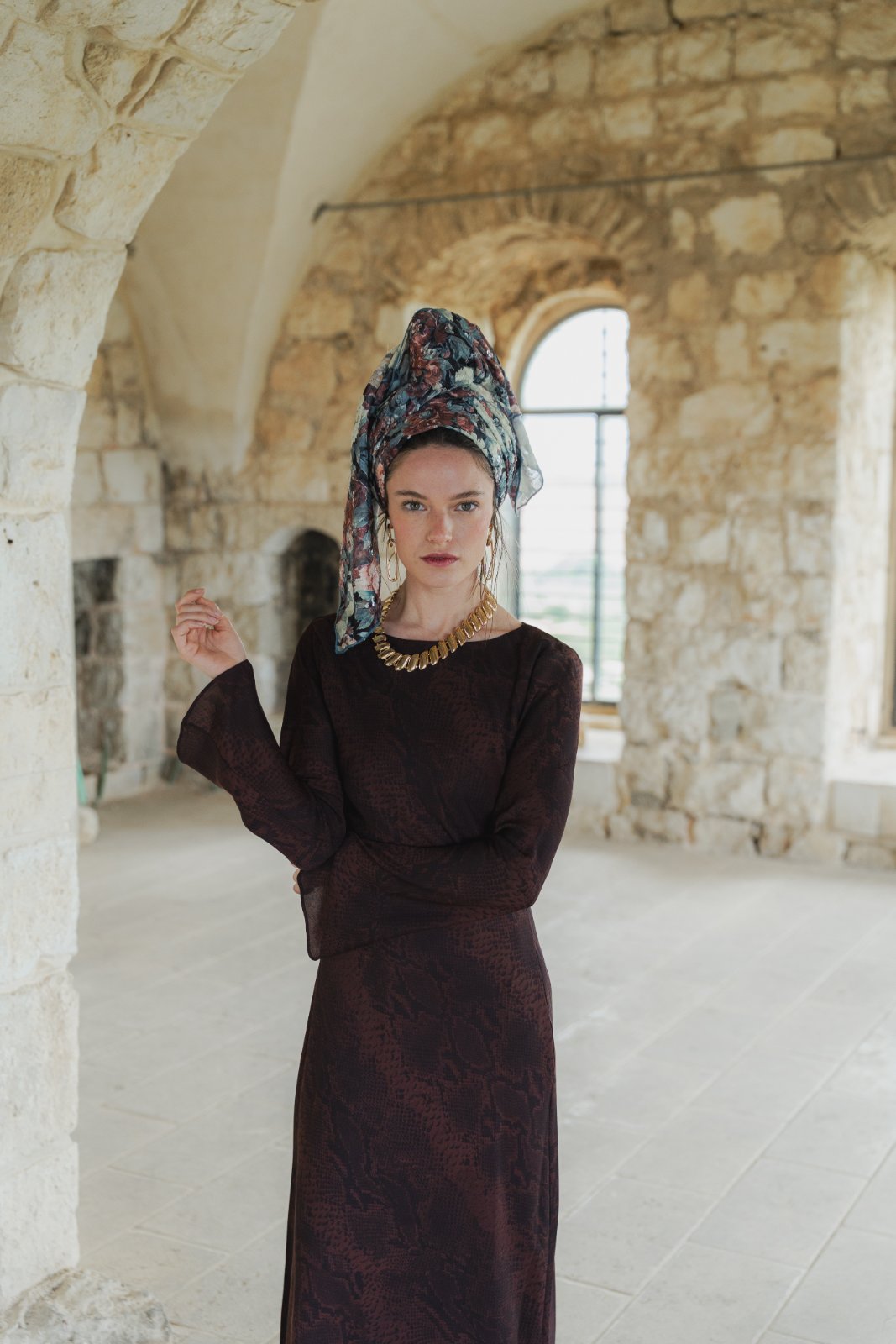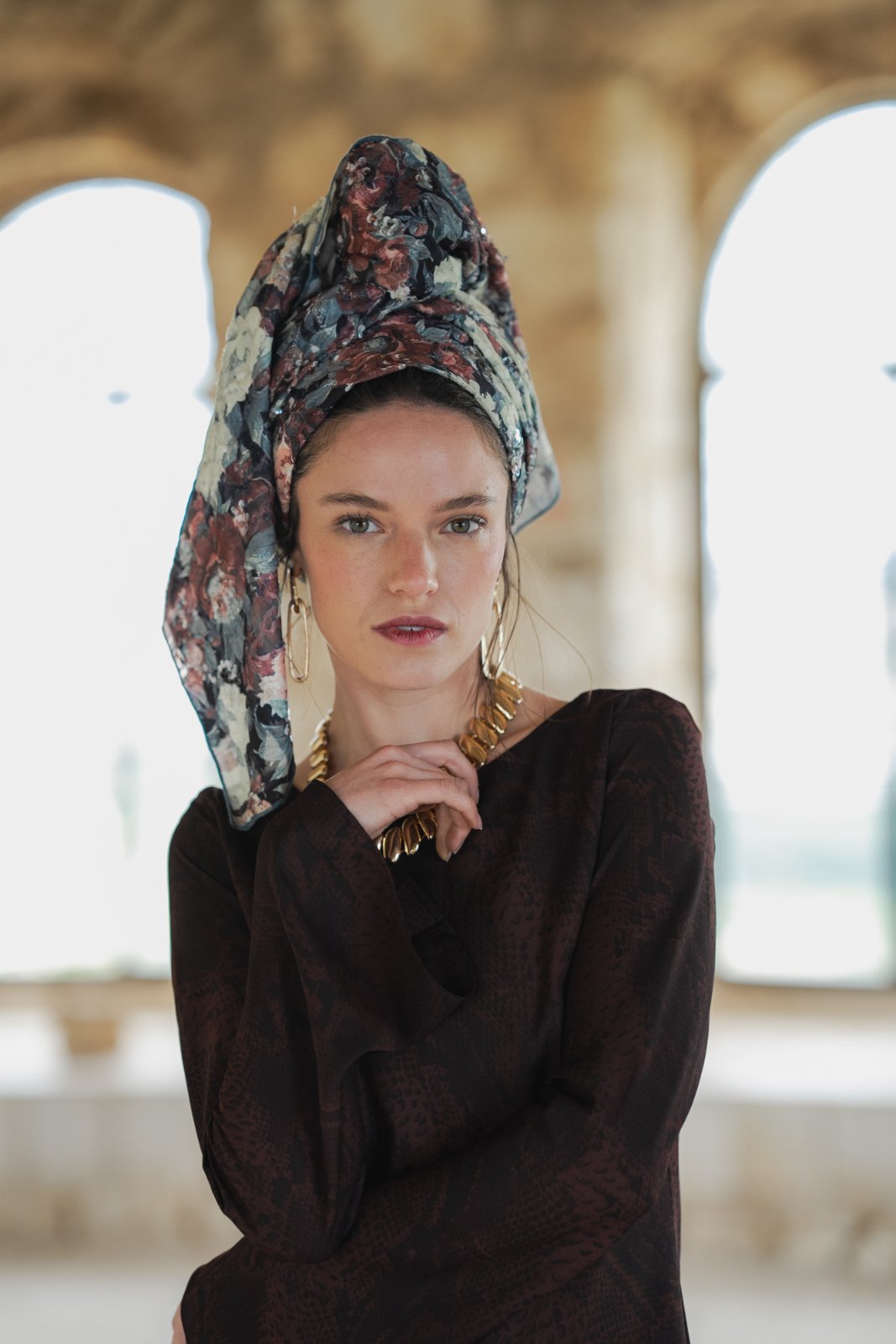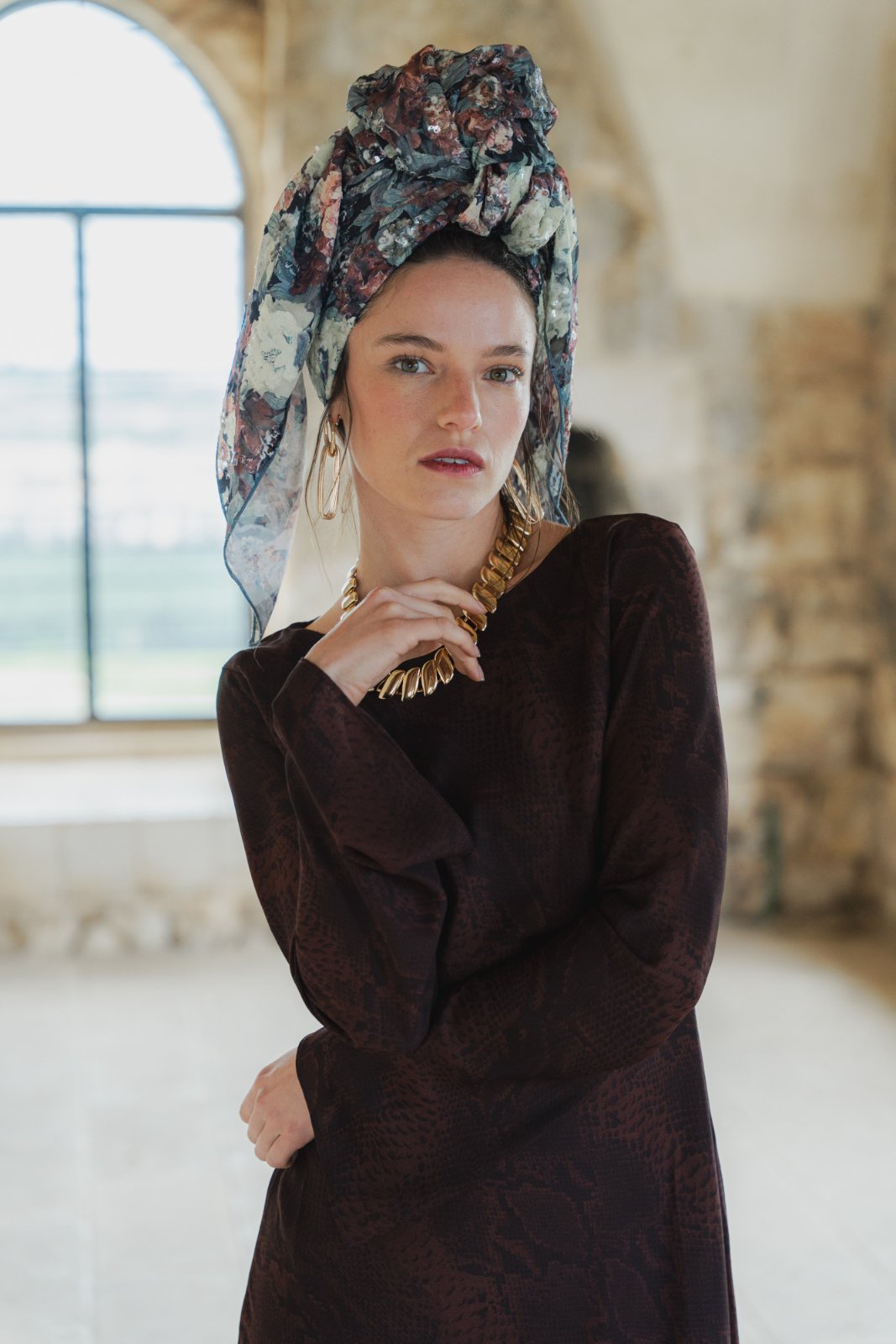 הדפס פרחוני עשיר ודרמתי בעל אופי ציורי, בגוונים עמוקים של בורדו, חמרה, כחול – אפרפר מעושן וירוק פטרול.