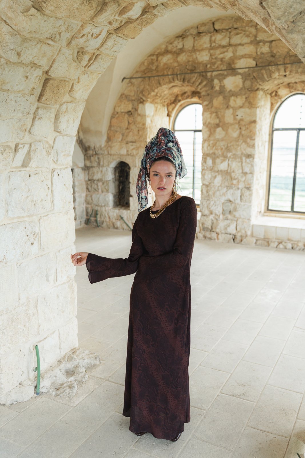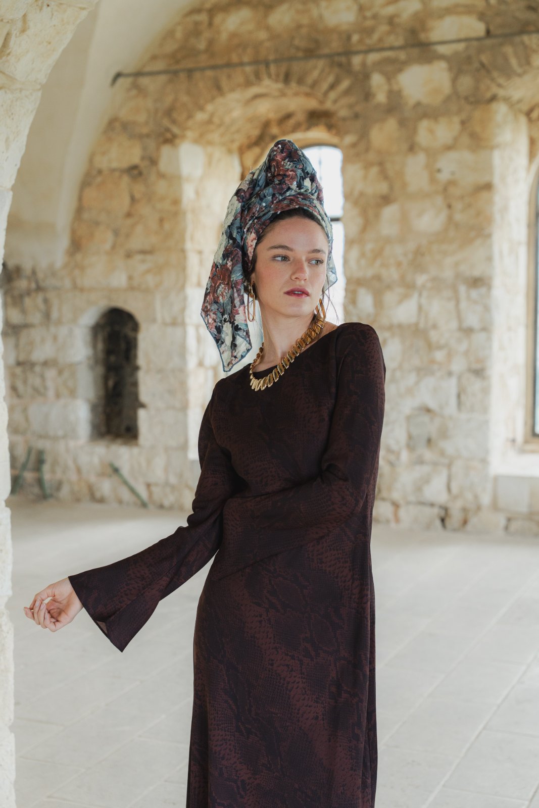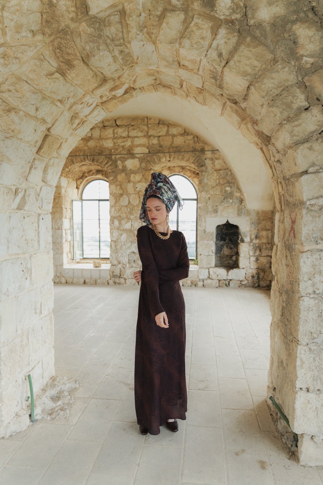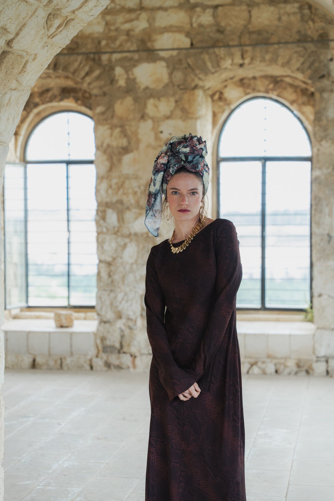 הדפס פרחוני עשיר ודרמתי בעל אופי ציורי, בגוונים עמוקים של בורדו, חמרה, כחול – אפרפר מעושן וירוק פטרול.
