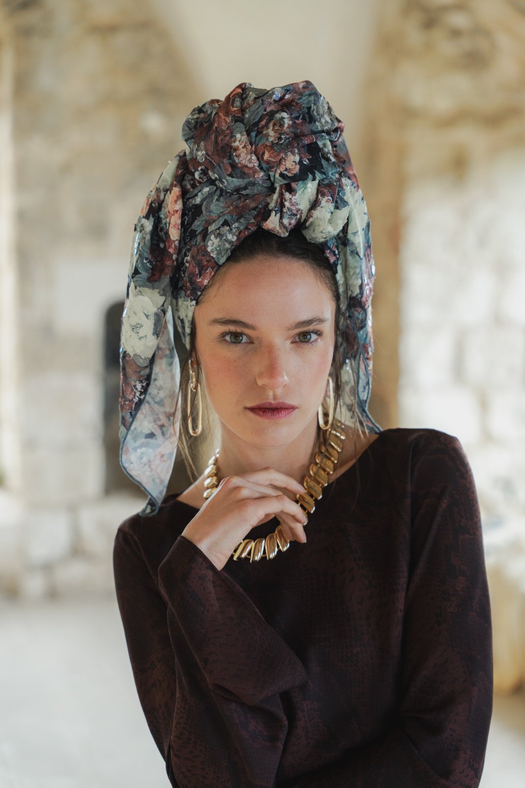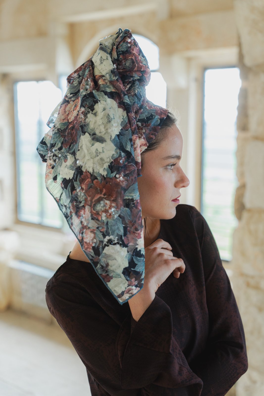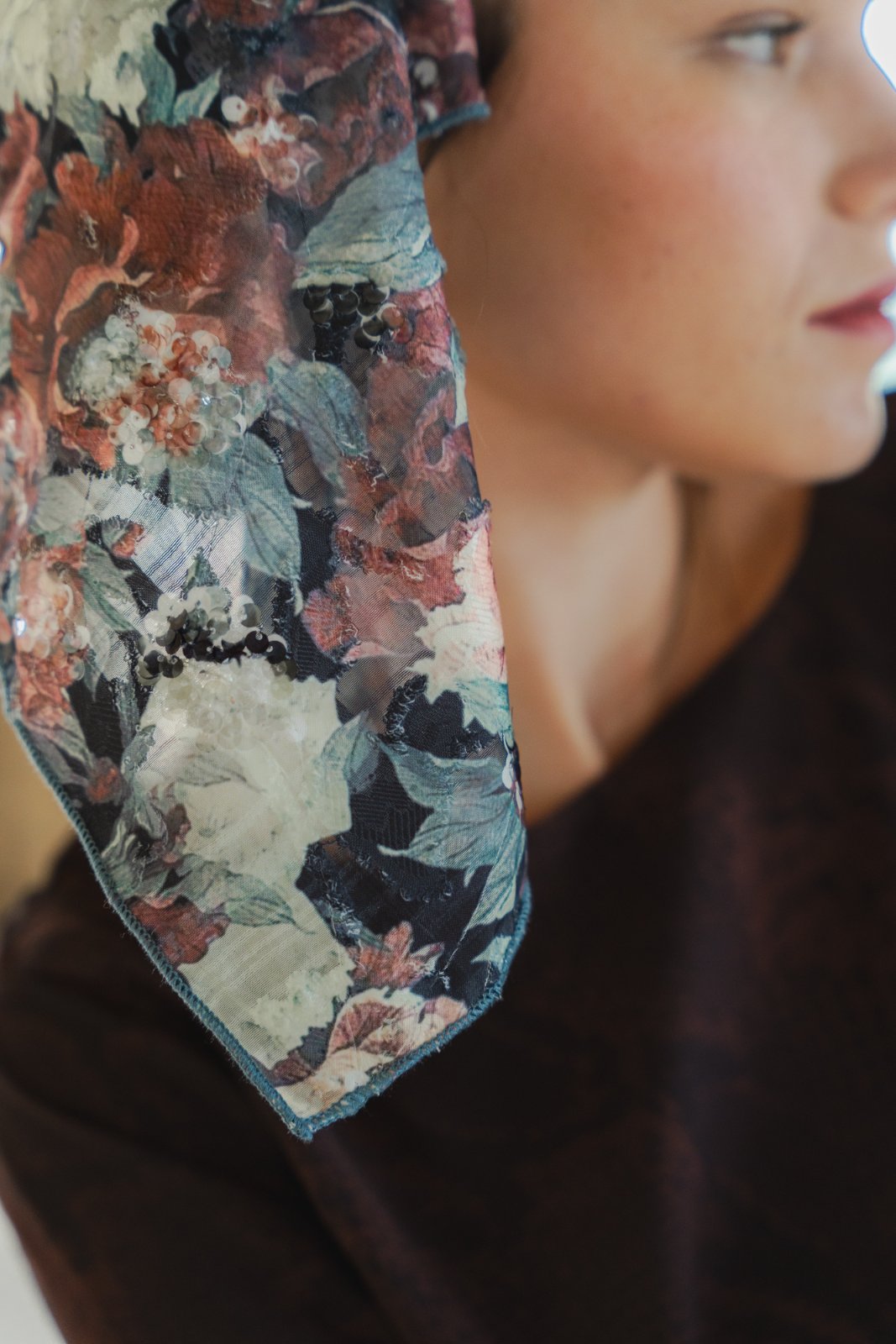 בעוד נגיעות עדינות של פאייטים עדינות מוסיפות ברק רך שמעניק למטפחת מראה אלגנטי ומלא נוכחות