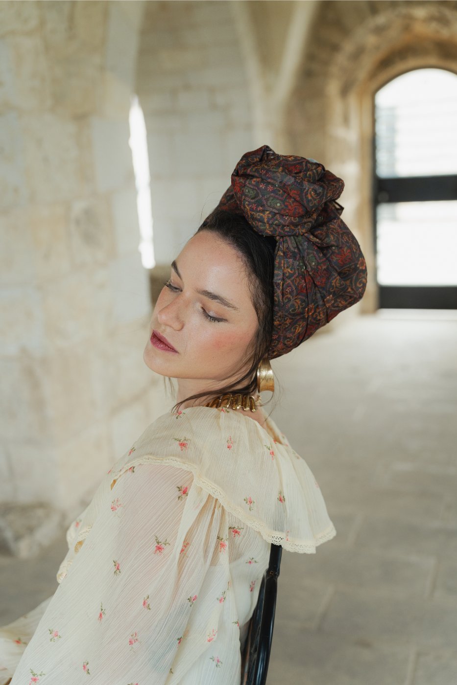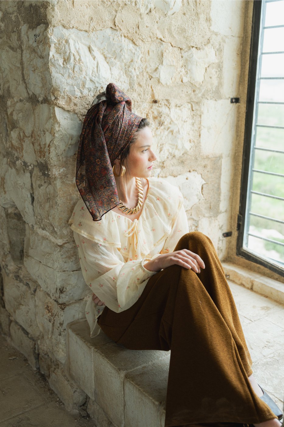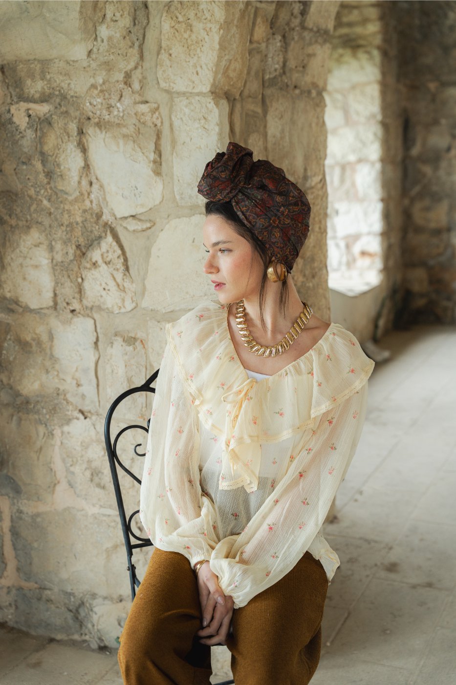 בתוך המארג מופיעות נגיעות צבע חמות- אדום חמרא עמוק, זהב מעושן, חרדל עתיק, נגיעות ירקרקות וכחלחלות