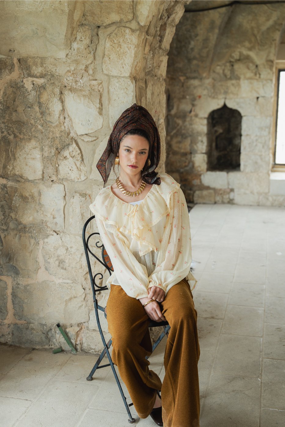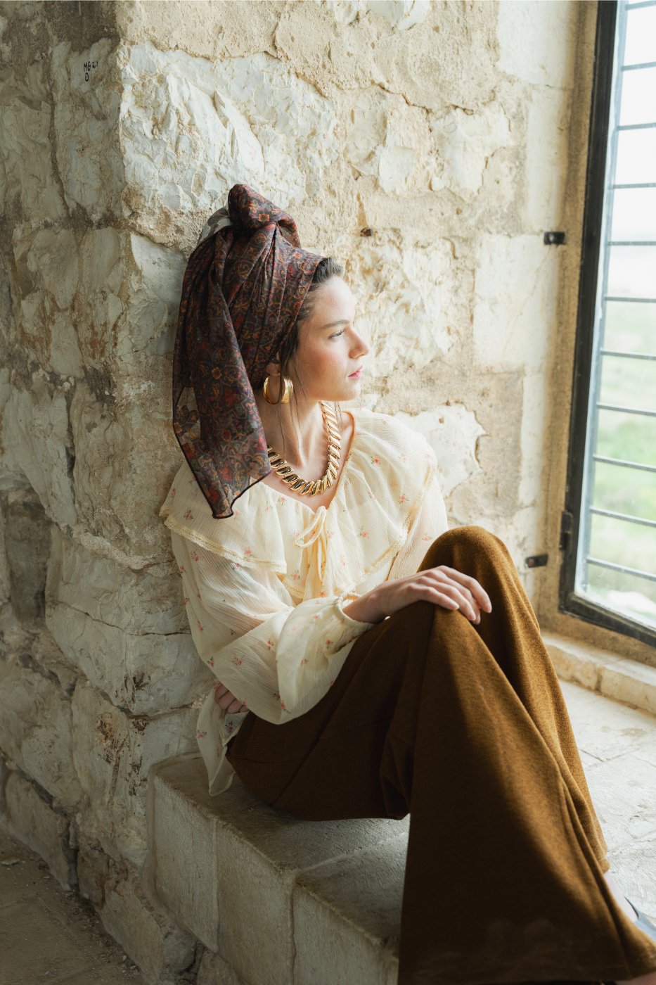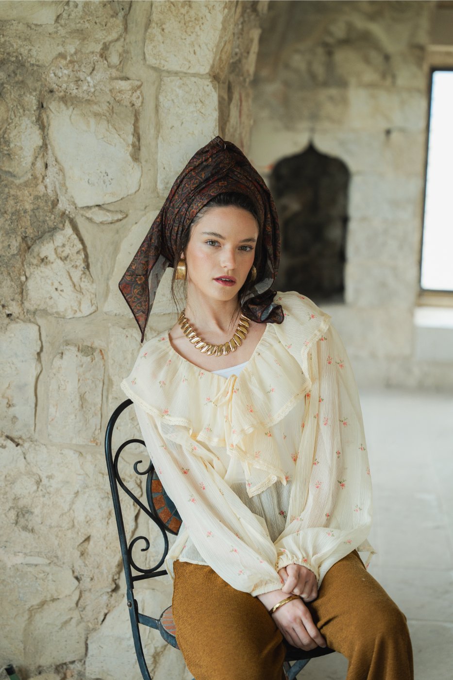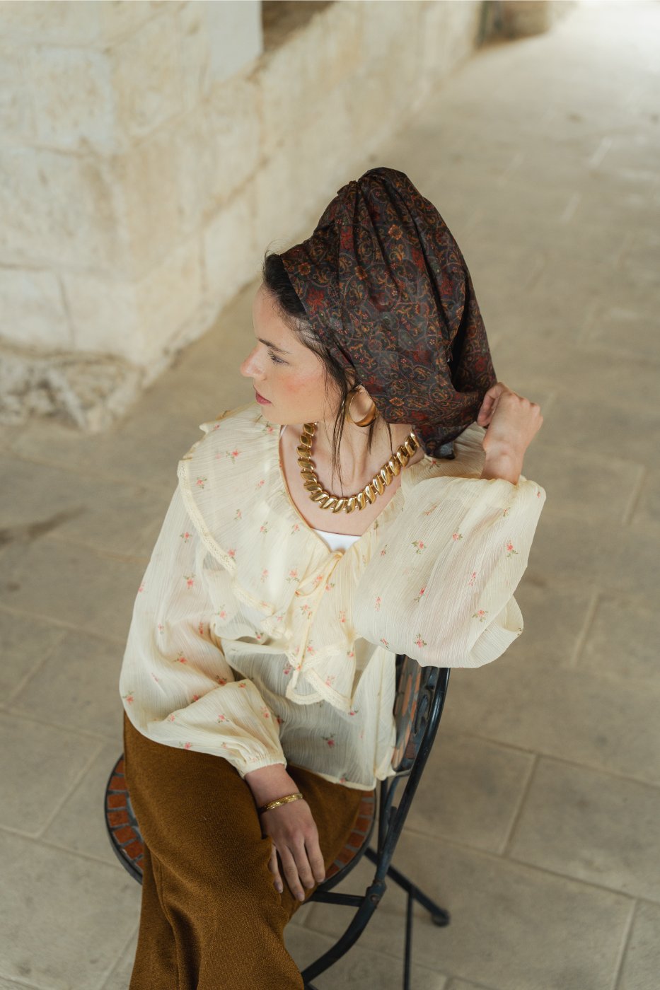 בתוך המארג מופיעות נגיעות צבע חמות- אדום חמרא עמוק, זהב מעושן, חרדל עתיק, נגיעות ירקרקות וכחלחלות