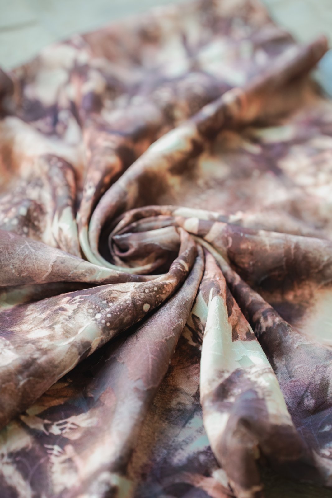 הדפס בגווני חום עמוק וזהב עתיק המשתלבים במרקם אורגני המזכיר ציור בצבעי אדמה טבעיים.