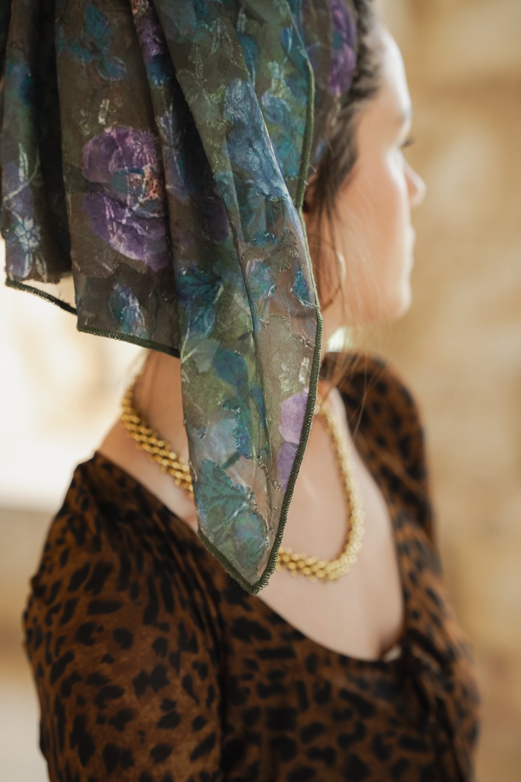 שילוב הצבעים יוצר מראה עשיר ומסתורי המזכיר גן פרחים באור ערב.