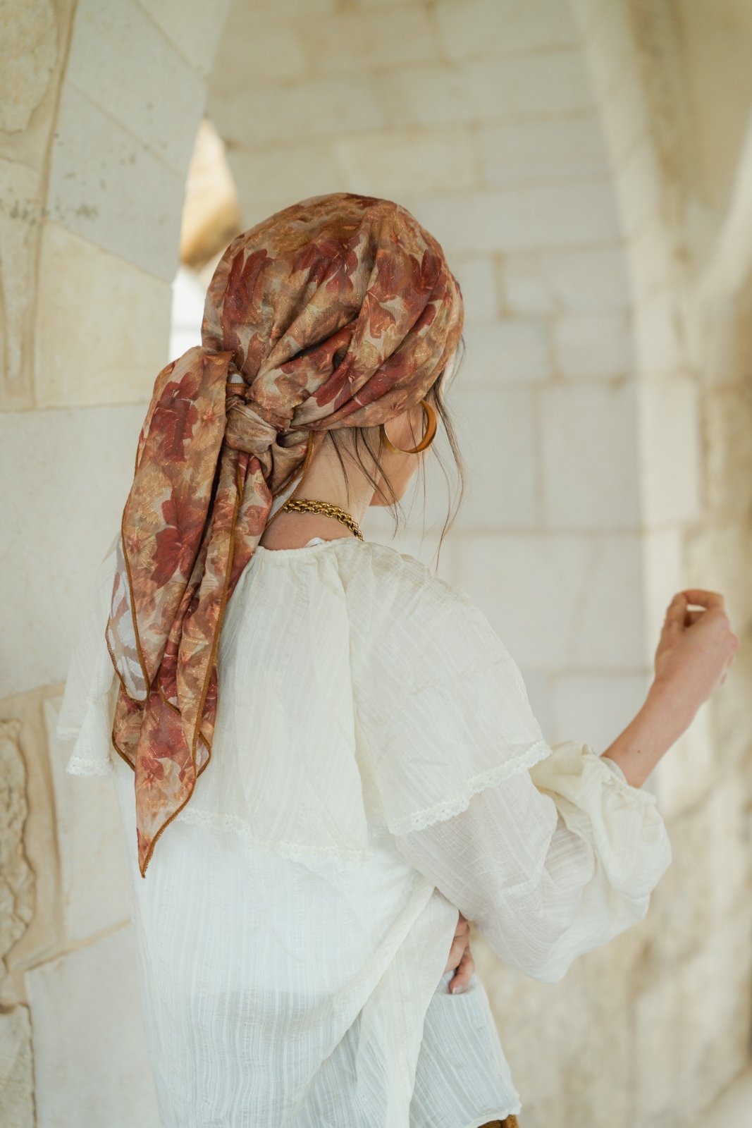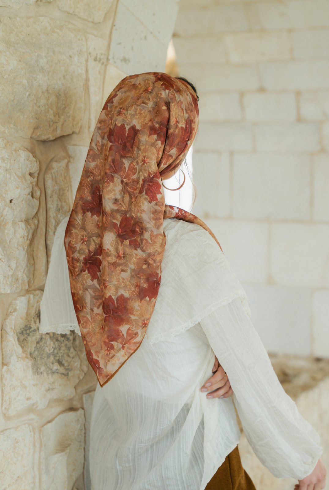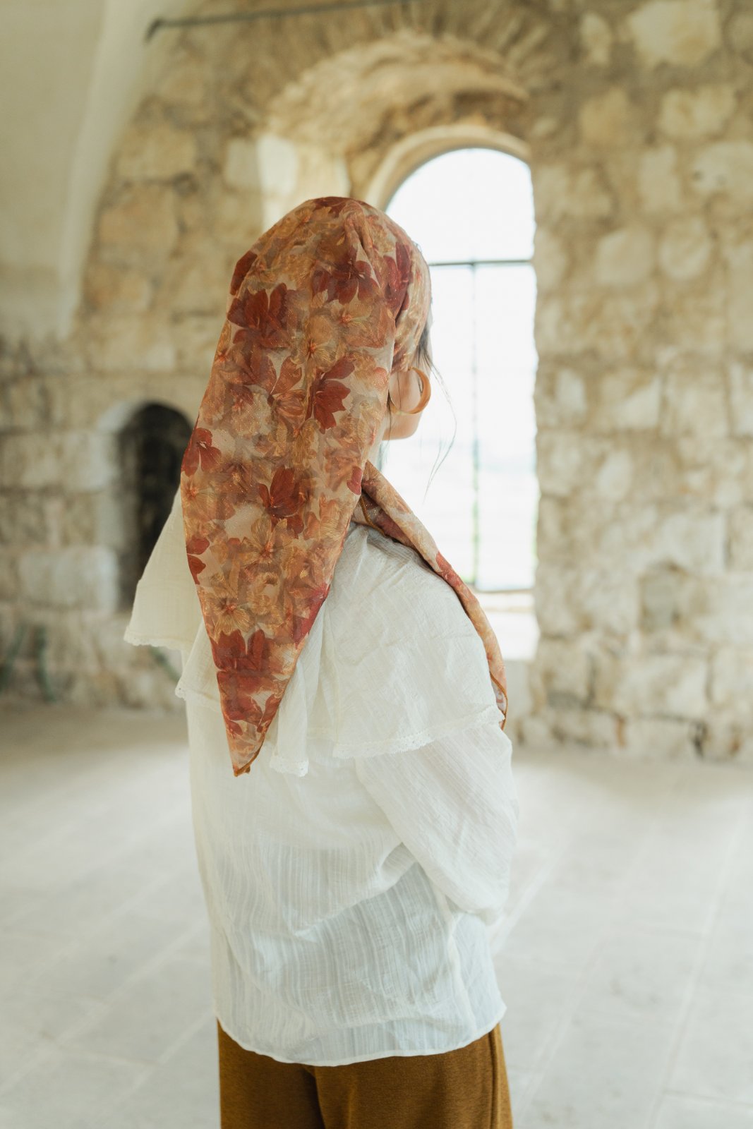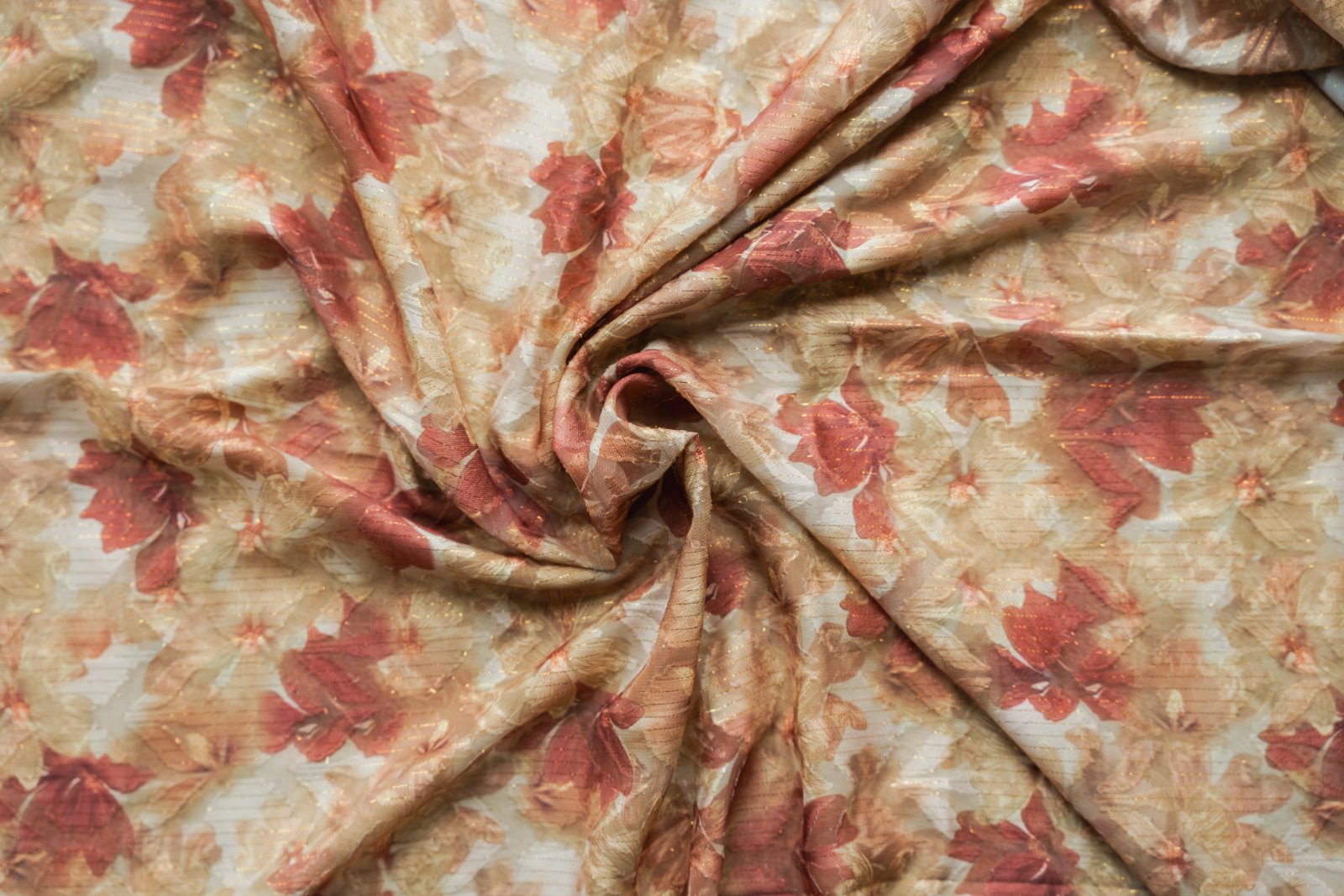 הדפס מהפנט פרחוני ורומנטי, גוונים חמימים של חמרה, טרקוטה, אדמה שרופה וחום זהב. ובניהם נגיעות עדינות של זהב מנצנץ