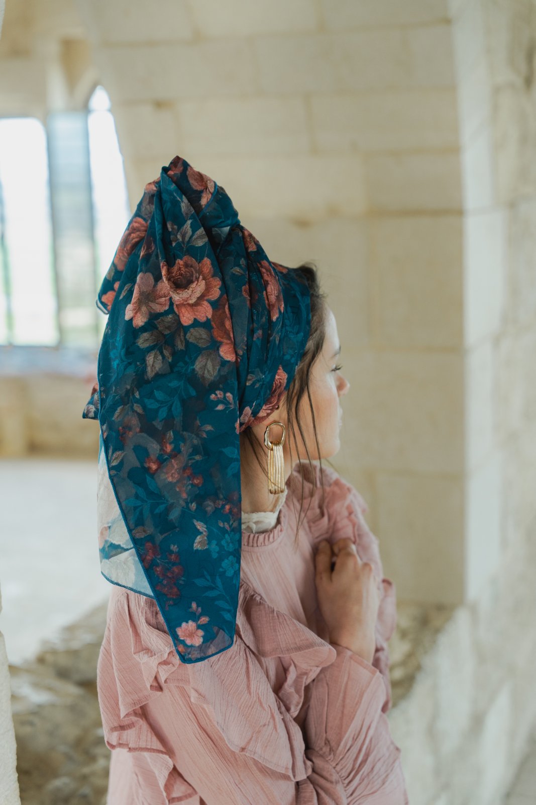 גווני טורקיז וכחול פטרולי, בתוכו פורחים פרחים בגווני ורוד עתיק ורוזה מעושנת.